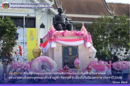 เวลา 07.30 น. นายวิบูรณ์ แววบัณฑิต ผู้ว่าราชการจังหวัดลำปาง เป็นประธานในพิธีวางพวงมาลาถวายราชสักการะ เนื่องในวันคล้ายวันสวรรคตพระบาทสมเด็จพระจุลจอมเกล้าเจ้าอยู่หัว วันปิยมหาราช ประจำปี 2568 พร้อมด้วย นางสุดารัตน์ แววบัณฑิต นายกเหล่ากาชาดจังหวัดลำปาง/ประธานแม่บ้านมหาดไทยจังหวัดลำปาง นายกฤษณะ พินิจ รองผู้ว่าราชการจังหวัดลำปาง คณะผู้บริหาร หัวหน้าส่วนราชการ หน่วยงาน ภาครัฐ รัฐวิสาหกิจ เอกชน และประชาชนทุกหมู่เหล่า ร่วมประกอบพิธีวางพวงมาลา เพื่อแสดงความจงรักภักดีและสำนึกในพระมหากรุณาธิคุณ ที่ทรงมีต่อประเทศชาติและประชาชนชาวไทย ณ พระบรมราชานุสาวรีย์ พระบาทสมเด็จพระจุลจอมเกล้าเจ้าอยู่หัว สนามด้านหน้าศาลากลางจังหวัดลำปาง