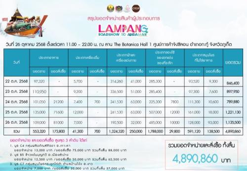 ณ ลาน The Botanica Hall 1 ศูนย์การค้าจังซีลอน อำเภอกะทู้ จังหวัดภูเก็ต จังหวัดลำปางนำผู้ผลิตผู้ประกอบการ OTOP จำนวนกว่า 40 ราย ร่วมกิจกรรมการจัดแสดงและจําหน่ายสินค้า “OTOP ล้านนาลําปางสู่อันดามัน” ภายใต้โครงการพัฒนาผู้ประกอบการและยกระดับศักยภาพสินค้าจังหวัดลําปาง ซึ่งกำหนดจัดขึ้นระหว่างวันที่ 22-26 ตุลาคม 2568 เวลา 11:00 น ถึง 22:00 น