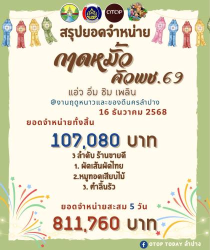 ยอดจำหน่ายสินค้า ภายใน “กาดหมั้ว คัว พช.” วันที่ 16 ธันวาคม 2568 @ งานกาชาดและของดีนครลำปาง ประจำปี 2569 ยอดจำหน่าย 107,080 บาท ยอดจำหน่ายสะสม 5 วัน จำนวน 811,760 บาท