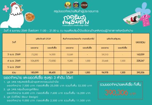 ยอดจำหน่ายสินค้าภายในงาน จำนวน 390,306 บาท 3 อันดับ ร้านค้าขายได้ ณ วันที่ 4 เมษายน 2569 ได้แก่