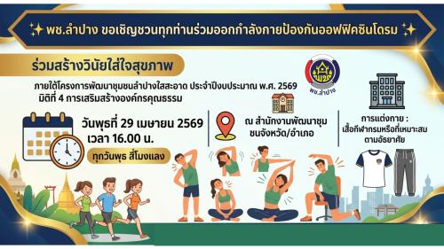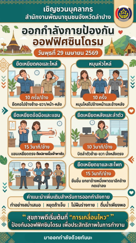 วันที่ 29เมษายน 2569 เวลา 16.40 น. นางจิรา บุญบรรจง พัฒนาการจังหวัดลำปาง มอบหมายนายเอกฉัตร กันหอม ผู้อำนวยการกลุ่มงานประสานและสนับสนุนการบริหารงานพัฒนาชุมชน นำทีมบุคลากรในสังกัดสำนักงานพัฒนาชุมชนจังหวัดลำปาง ร่วมออกกำลังกาย การยืดเหยียดกล้ามเนื้อ ลดความเครียดสะสม ที่เกิดจากการทำงานตลอดวัน ลดความตึงเครียดของกล้ามเนื้อ อาการปวดเมื่อยกล้ามเนื้อคอ บ่า ไหล่ หลัง และข้อมือ เนื่องจากการปฏิบัติหน้าจอคอมพิวเตอร์ตลอดวัน